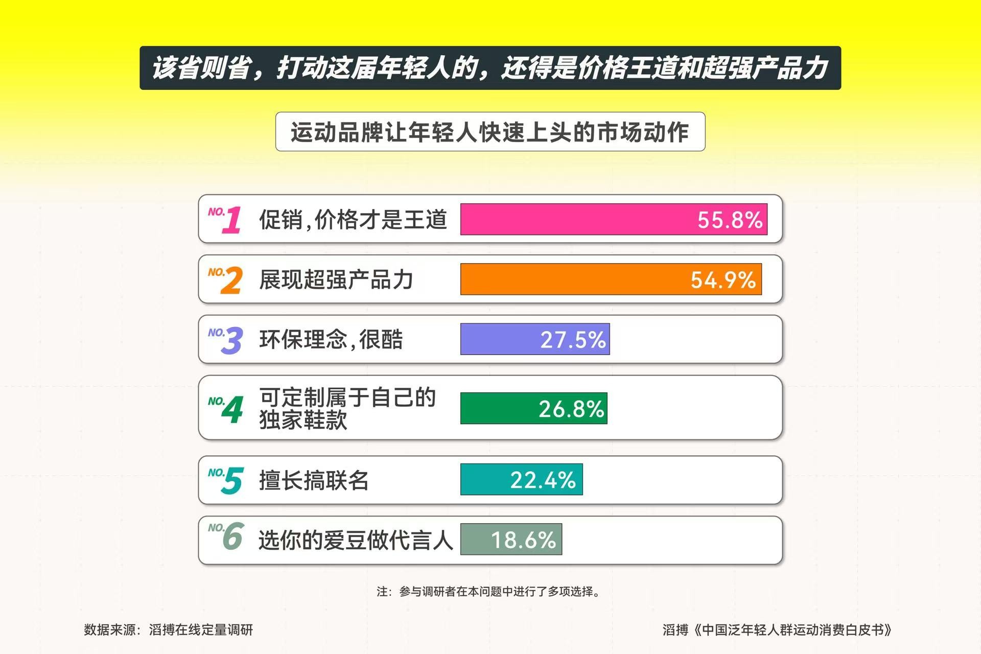 消费者更加谨慎的消费态度也体现在运动消费上。在运动品牌的一众市场动作中,最容易打动年轻人的是品牌的促销活动以及对于超强产品力的展现。此外,运动品牌对环保理念的倡导,以及进行定制、联名、偶像代言等营销动作,也能够在一定程度上促进年轻人的消费决策。