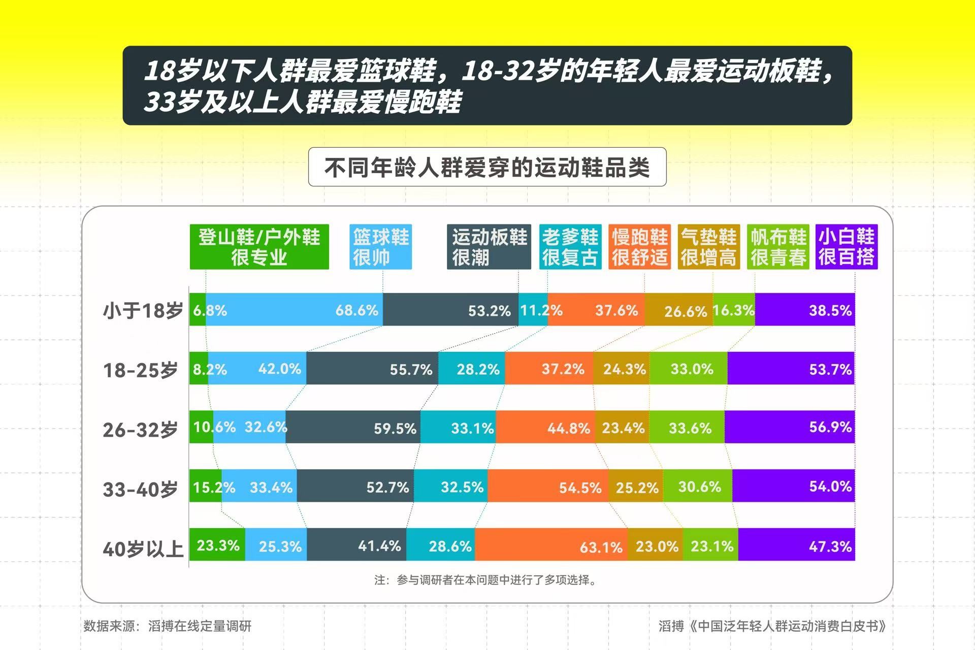 不同年龄的人有着不同的运动鞋品类偏好。18岁以下人群在生活中最爱穿的运动鞋品类是篮球鞋;18-25岁及26-32岁的年轻人运动鞋偏好趋同,最爱穿运动板鞋和小白鞋;33-40岁及40岁以上人群集体爱上跑步,最爱穿慢跑鞋。