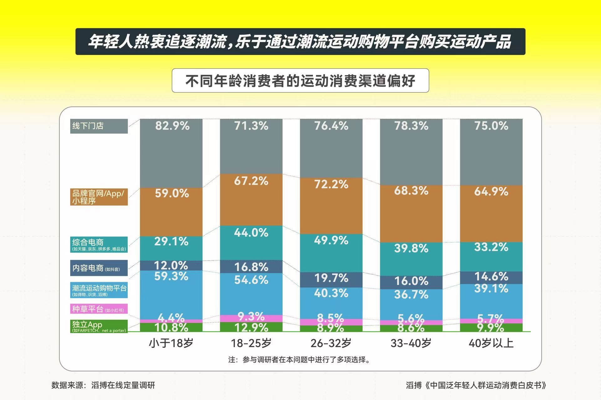 线下门店是运动消费的重要场景,各年龄段人群普遍偏好在线下门店购买运动产品。18岁以下人群在线下购买运动产品的人数比例高于其他年龄段人群,线下门店之外,他们也偏好通过潮流运动购物平台购买运动产品。品牌官网/App/小程序拥有官方背书,也是各年龄段人群偏好的运动产品购买渠道。综合电商平台是26-32岁人群购买运动产品的重要渠道,他们中选择通过综合电商平台购买运动产品的人数比例高于其他年龄段人群。