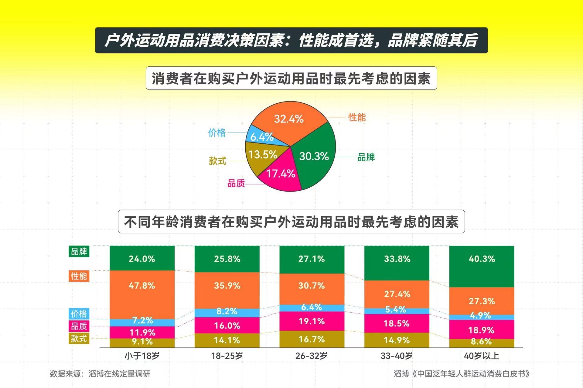 在购买户外运动用品时,最先考虑性能的消费者多于最先考虑品牌的消费者。年纪越小的消费者,最先考虑性能的比例越高。随着年龄的增长,品牌属性在户外消费决策中的重要度不断增加。