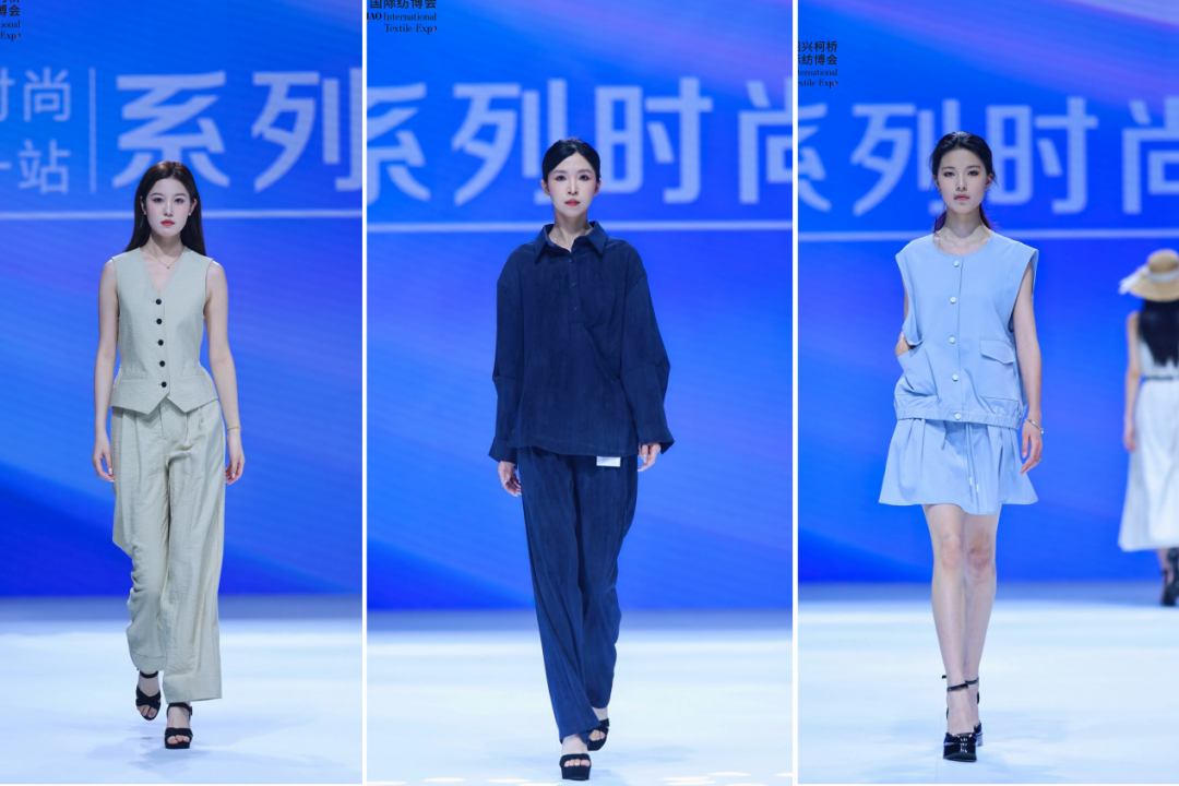 纺博会首日,展馆内光影璀璨,以“秀展结合 创新发展”为主题的旗舰商铺联合发布活动成为全场焦点。随着 T 台灯光与音乐渐起,新明君纺织、舜佳纺织、邦圣纺织携54套精选成衣依次亮相。这些秀品均由企业现有面料改造升级,通过工艺创新、剪裁拼接与版型优化,让时尚生命力在舞台之上悠然绽放、自然生长。