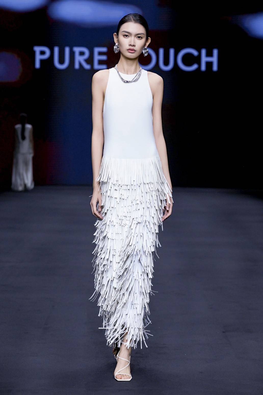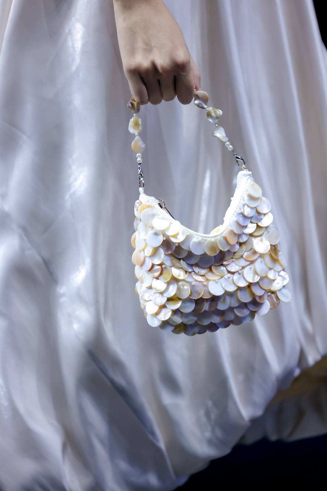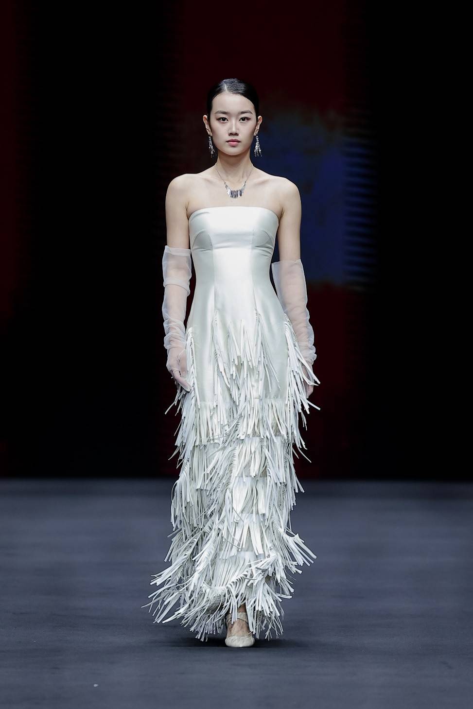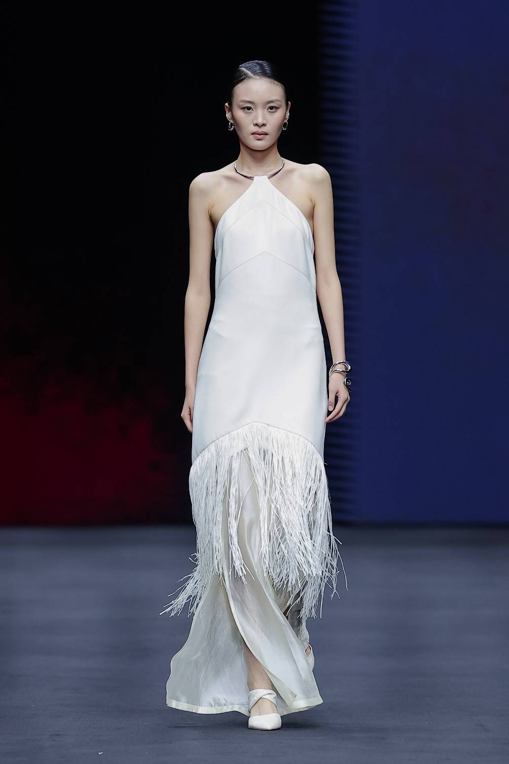 “逝者如斯夫”,时间总是不可抗的坦然流逝,秀场以千姿百态的流苏汇成不同形态的流动与逝去:可以如草木般茂盛恣意,可以层层叠叠细密垂坠,可以是带着皮质肌理与铆钉装饰的肆意不羁,亦可以是水晶珠串拼接的精致优雅……丝丝缕缕处的飘逸,浪漫灵动。