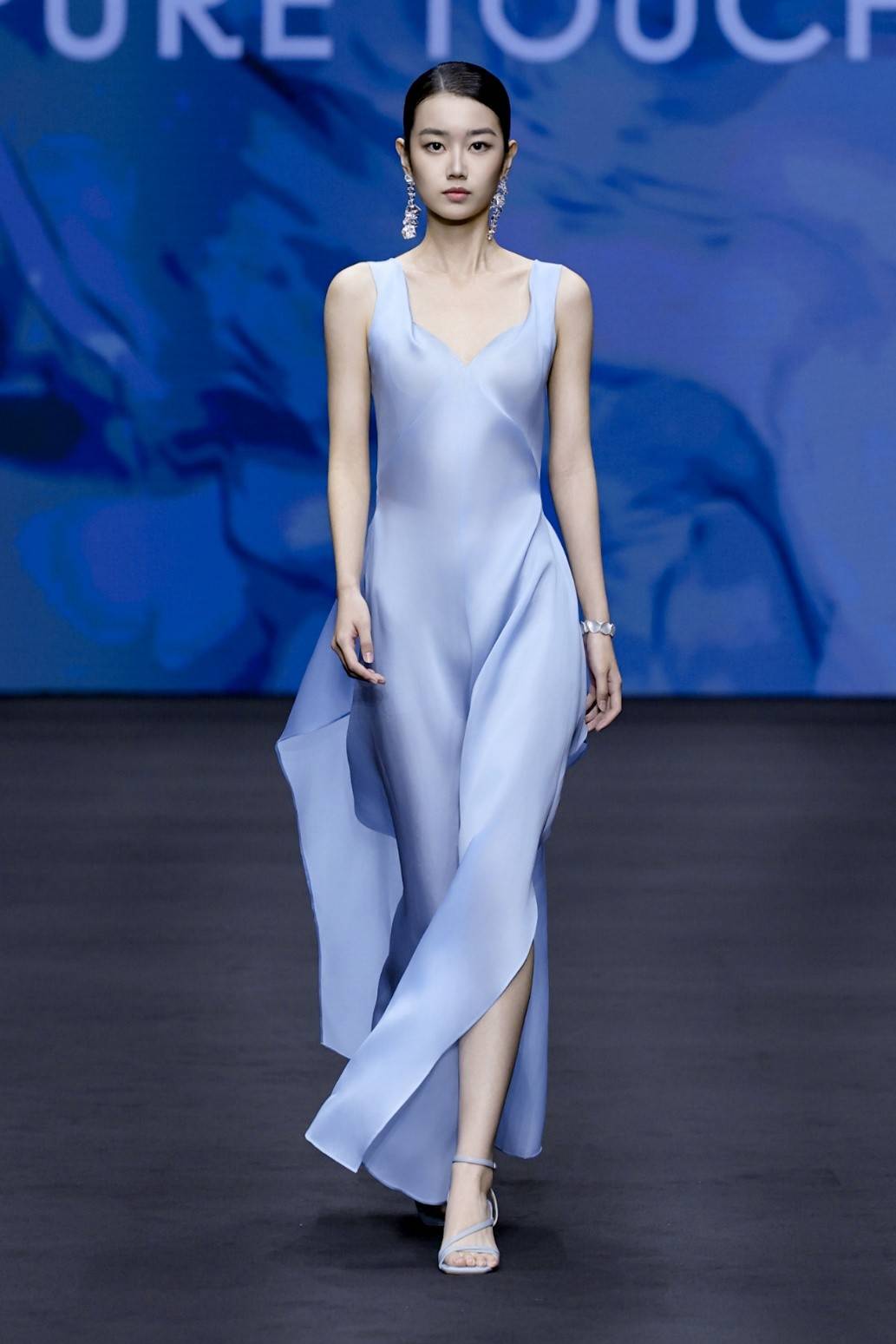 绡的轻盈,重缎的垂坠,波纹绸的肌理、丝毛面料的光泽……独属于天然材质的浪漫在柔美与坚韧之间游走,像风吹动枝叶的间隙,像光渗入纱线的肌理。在这场关于时间、秩序与柔软生成的哲思旅程里,大家沉浸式感受刘耀华所写:“毛毛细雨落在脸上,感觉自己要发芽了”。