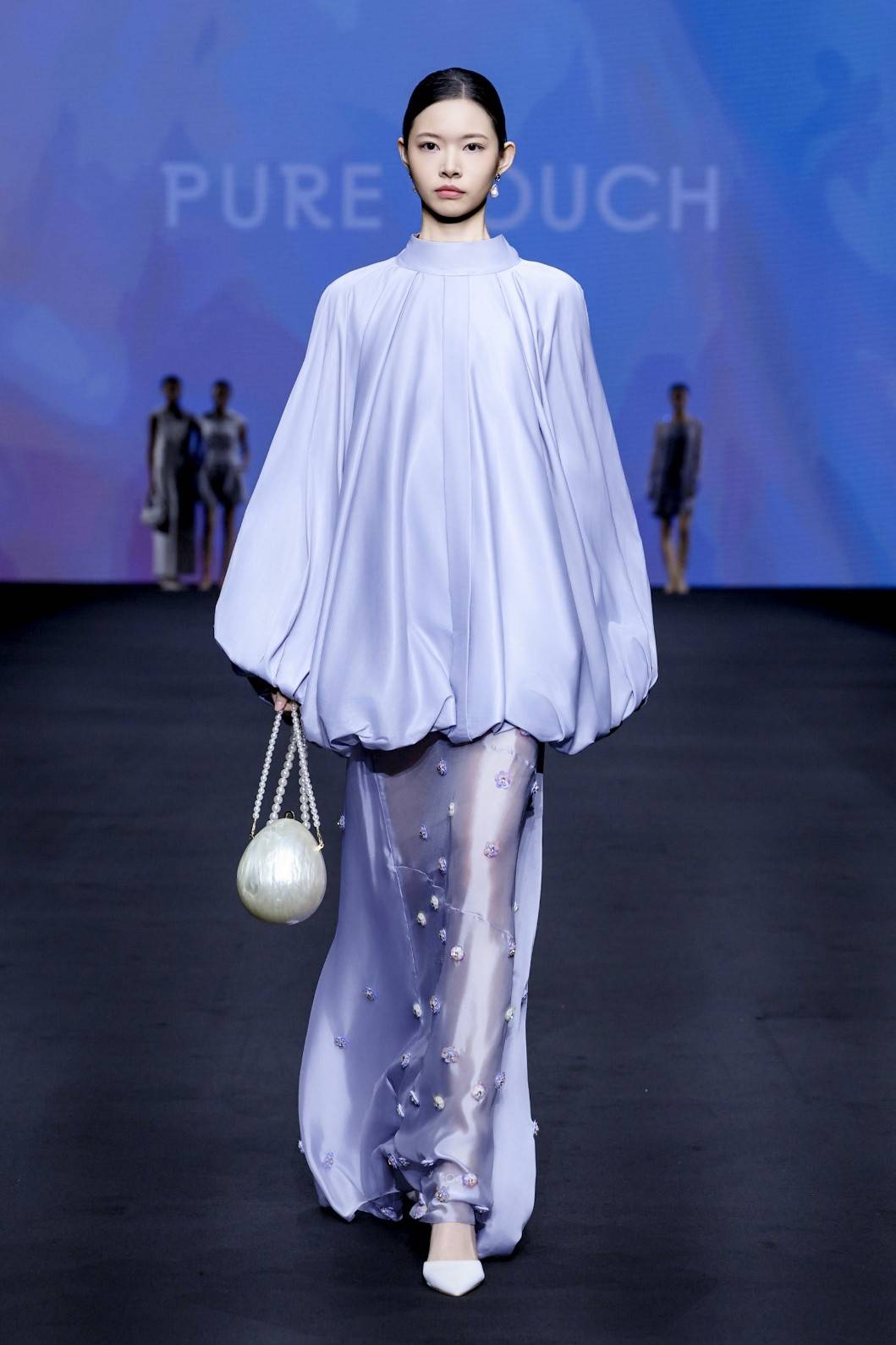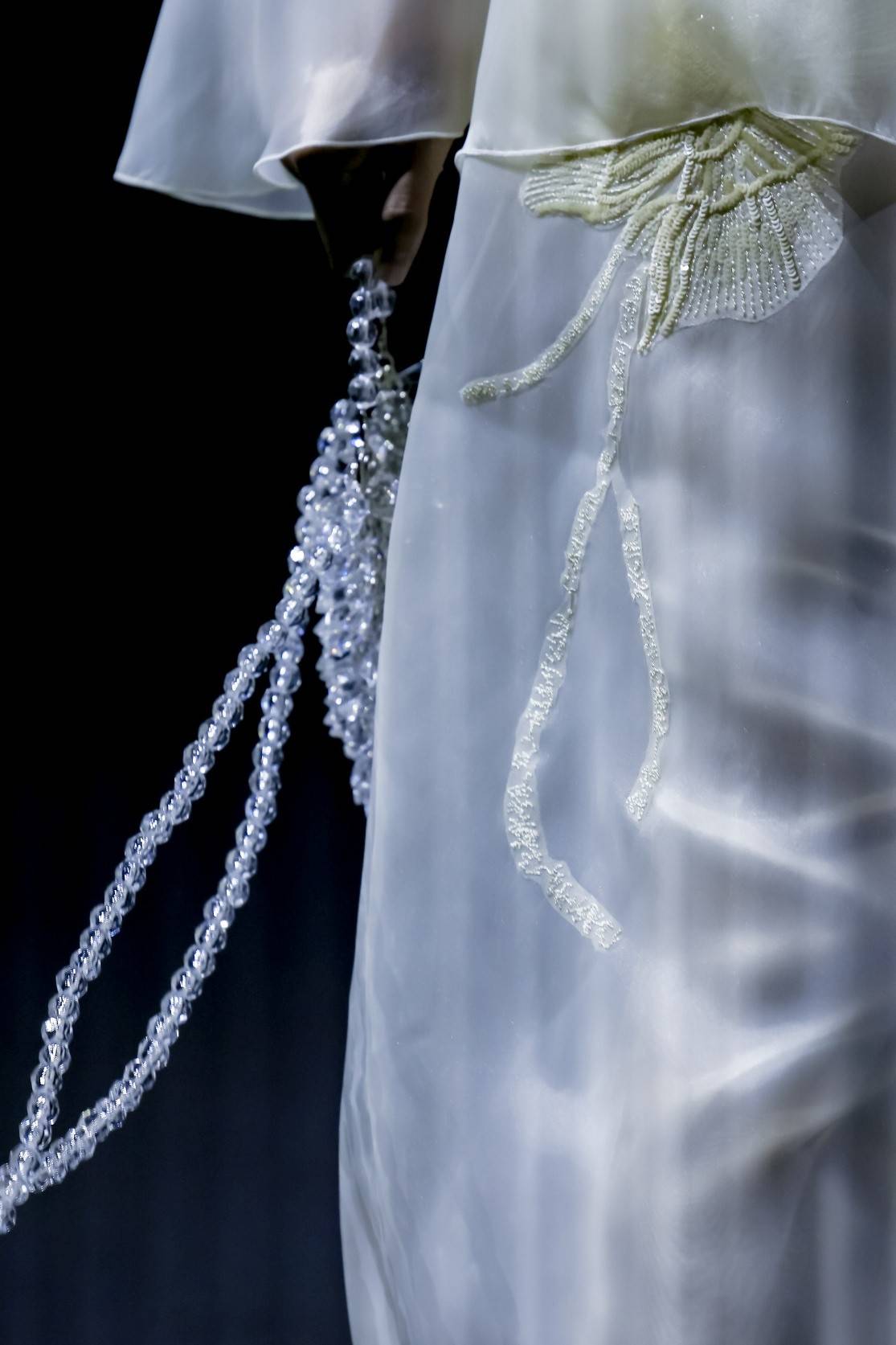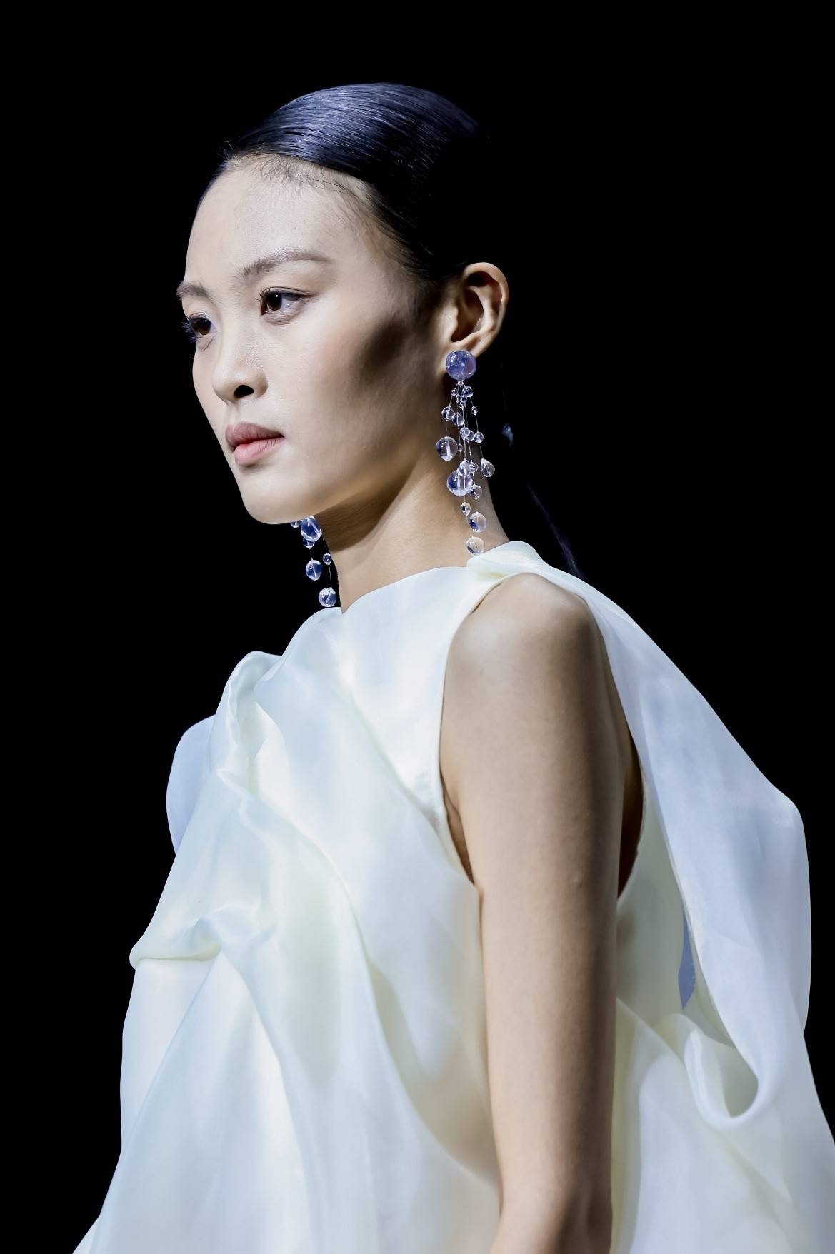 云灰色如破晓时分的低悬层云,将秀场带进“萦”对时间的解读——它在自然中从未笔直前行,而是在无尽漫游中留下永恒的痕迹。泛着微光的灰紫、清冷的裸粉与大地色系共同演绎“被风雨浸润过的时间痕迹”。独特的收拢工艺与灵动褶皱营造出蓬松饱满的廓形,包裹优雅内在,钉珠薄纱以清脆的通透感介入其中,隐约刺绣的诗句如藤蔓般蔓延。