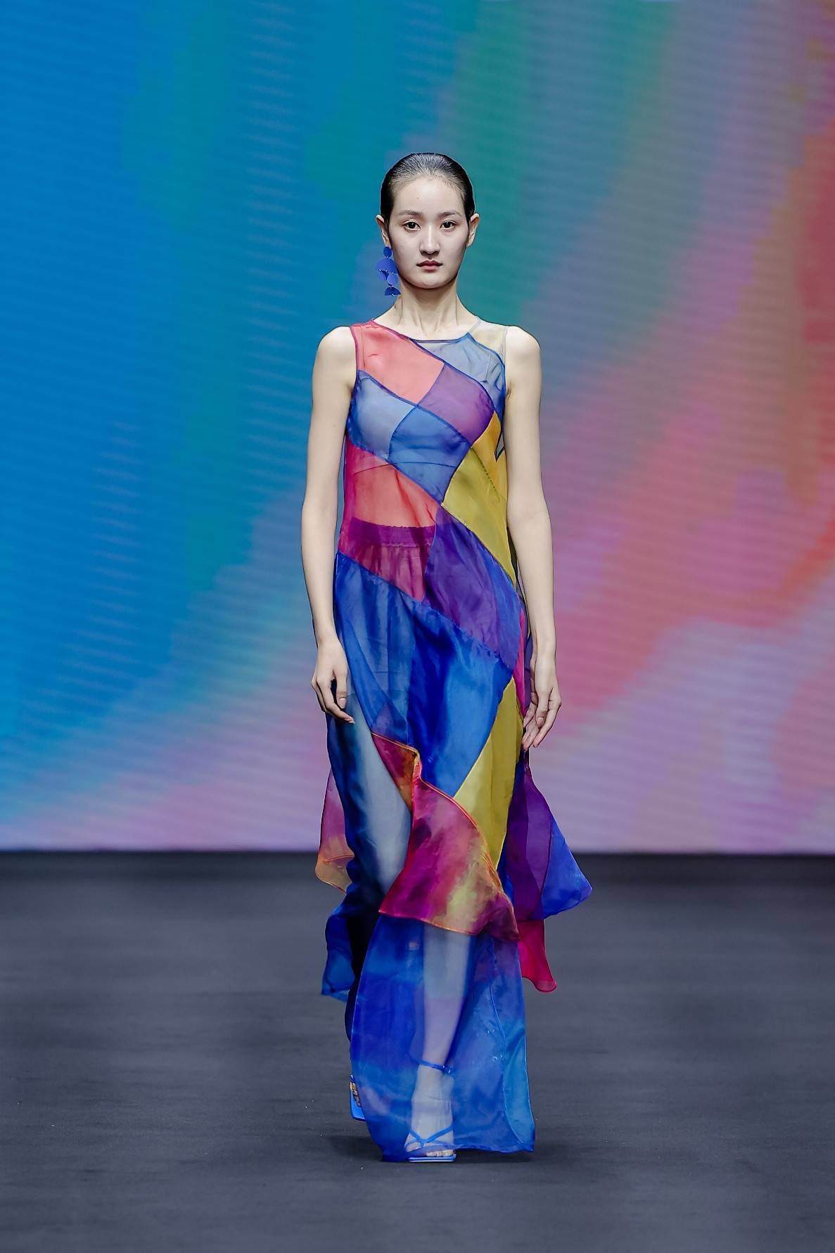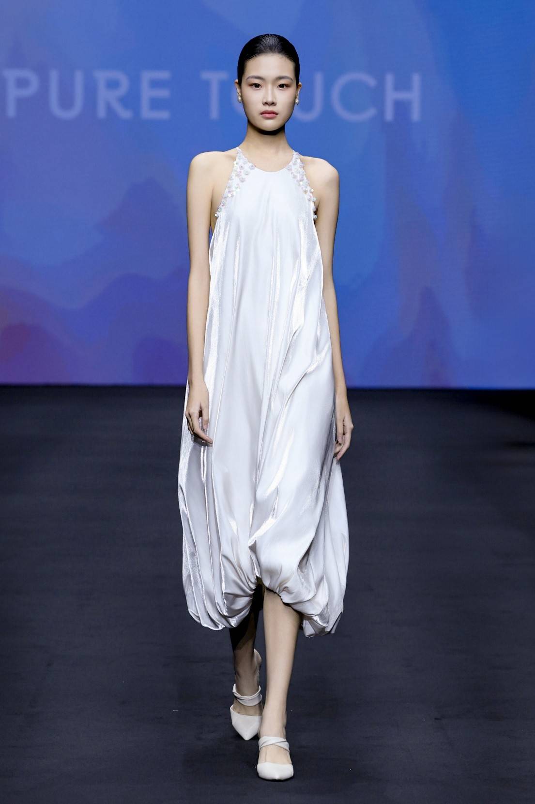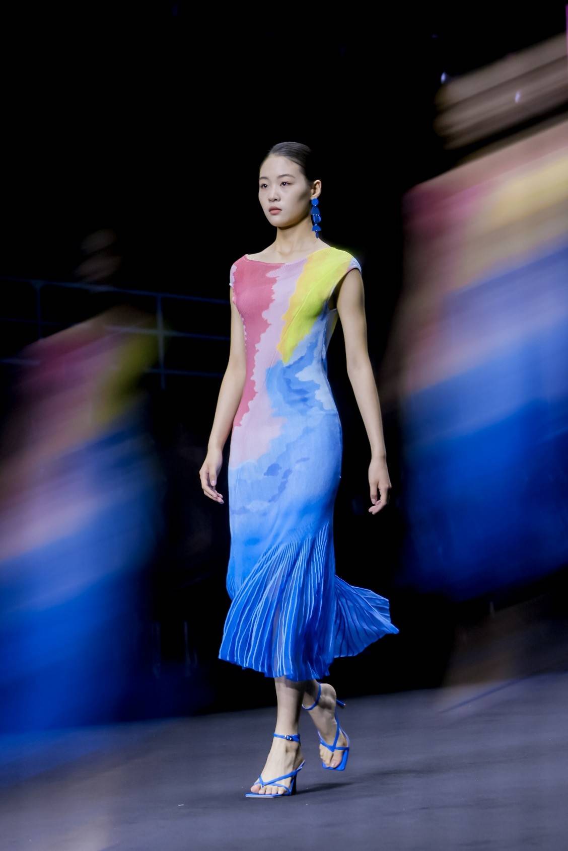 “蕴者,蓄也。”随着灯光变幻,夏日的明快色彩晕染整个秀场。缤纷色块在针织经纬间跳跃碰撞。鬼绉真丝、桑蚕丝针织面料与珠光面料形成刚柔并济的视觉张力。立体剪裁与不对称设计打破沉闷,硬挺收腰勾勒利落廓形,雾面雪纺如晨雾漫过棱角,裙裾处水波纹肌理暗涌,或化作针织提花的涟漪,或延展为扇形压褶的浪纹,行走间带起流动的光影诗篇。