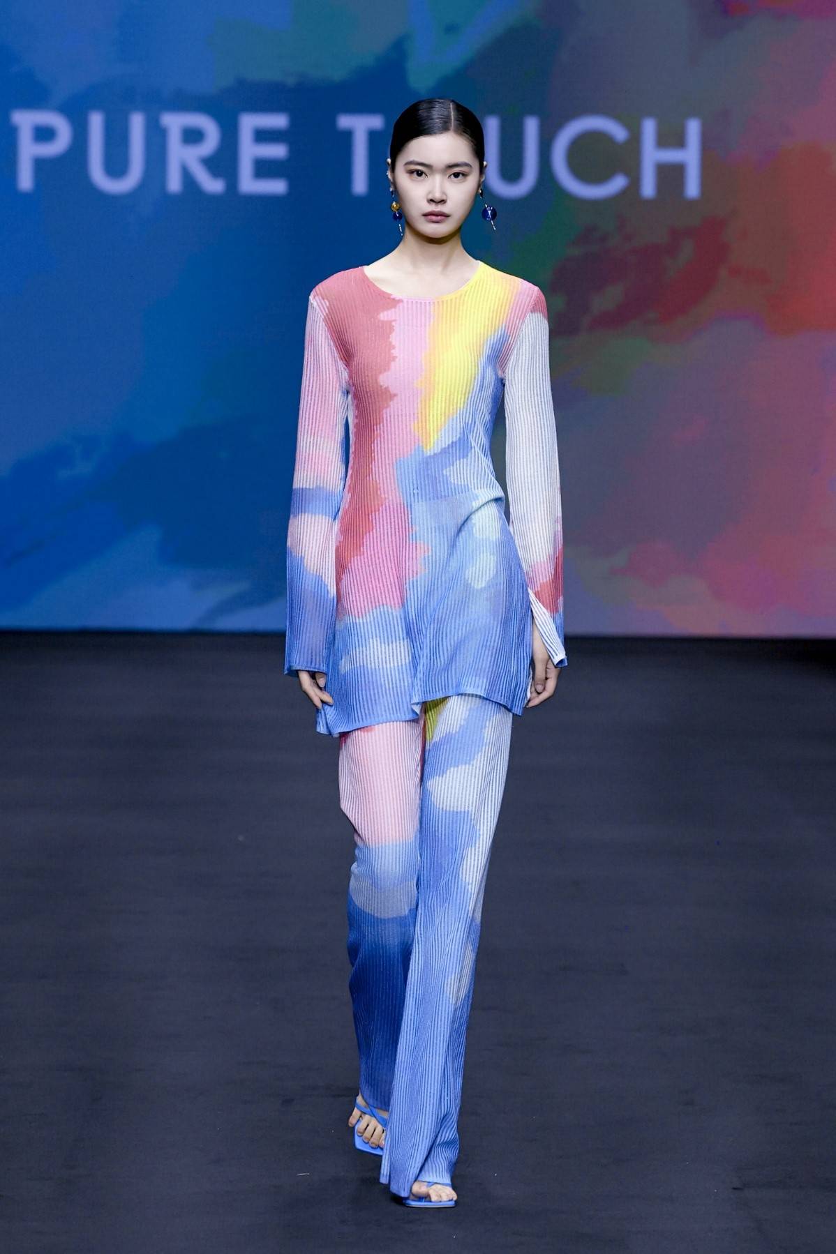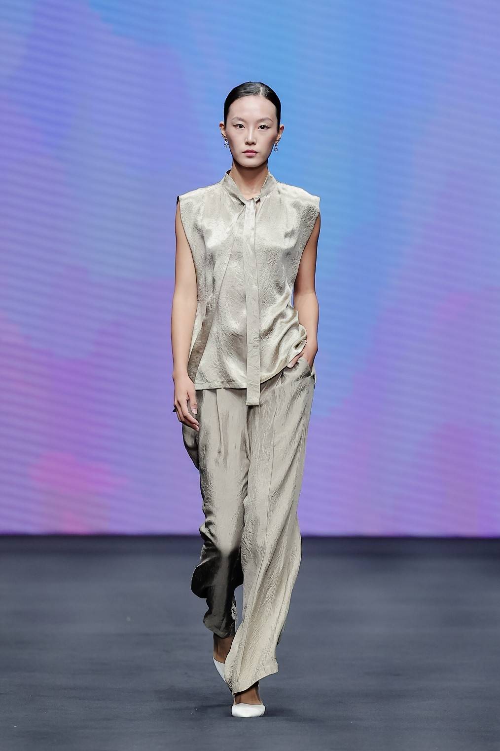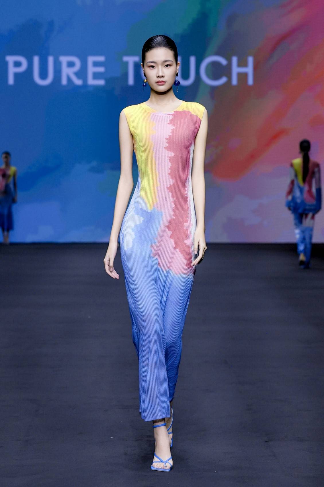 “蕴者,蓄也。”随着灯光变幻,夏日的明快色彩晕染整个秀场。缤纷色块在针织经纬间跳跃碰撞。鬼绉真丝、桑蚕丝针织面料与珠光面料形成刚柔并济的视觉张力。立体剪裁与不对称设计打破沉闷,硬挺收腰勾勒利落廓形,雾面雪纺如晨雾漫过棱角,裙裾处水波纹肌理暗涌,或化作针织提花的涟漪,或延展为扇形压褶的浪纹,行走间带起流动的光影诗篇。