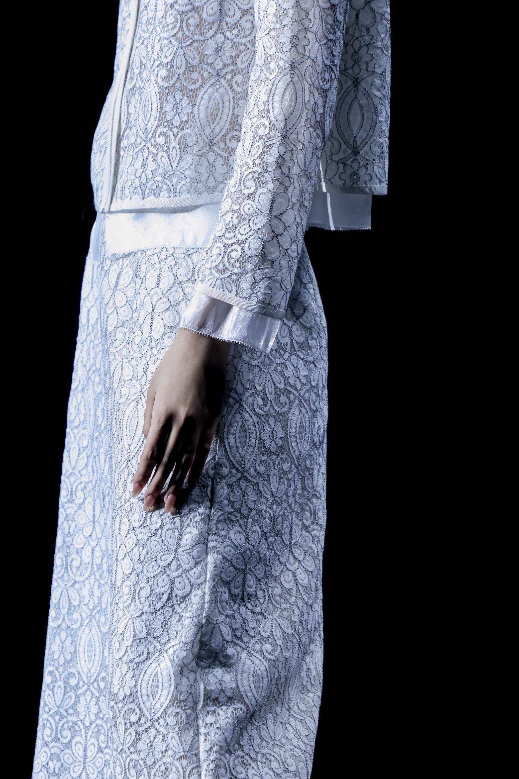 金属饰品将坚硬的质地与柔和线条结合,将每个诗意瞬间錾刻与流传。抹胸与露肩设计搭配宽松剪裁,诉说面对逝去的随性与坦然:“一片沸腾的湖,就算投下巨石,也不会荡起涟漪。”