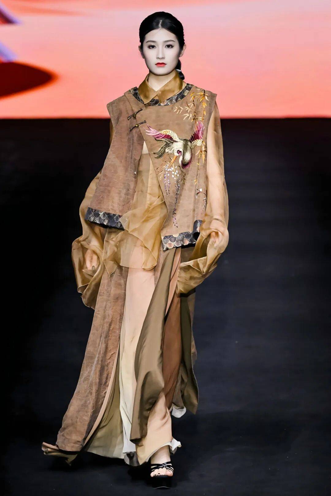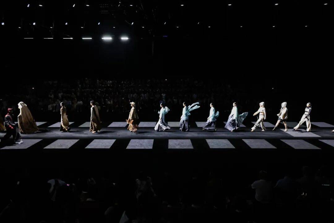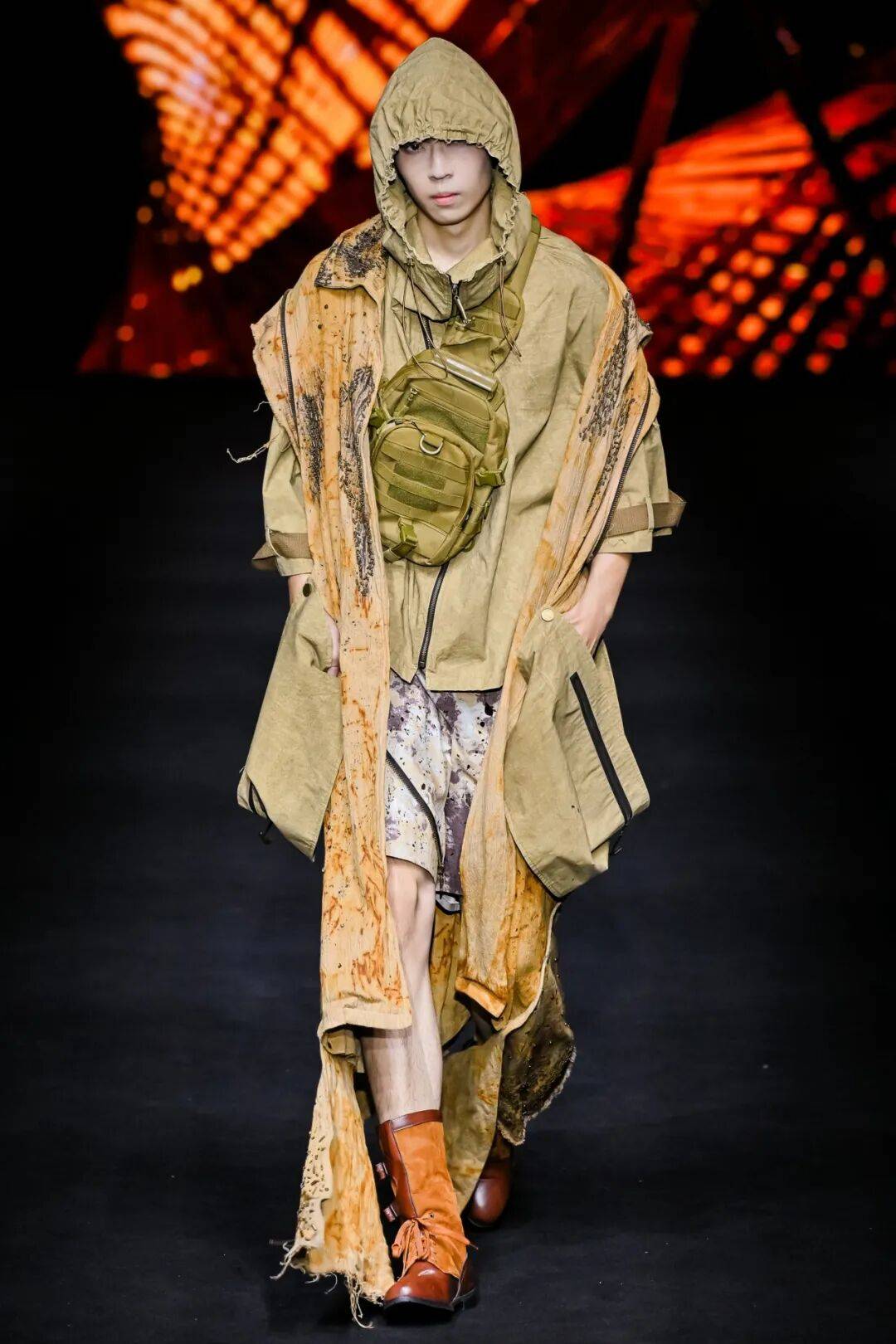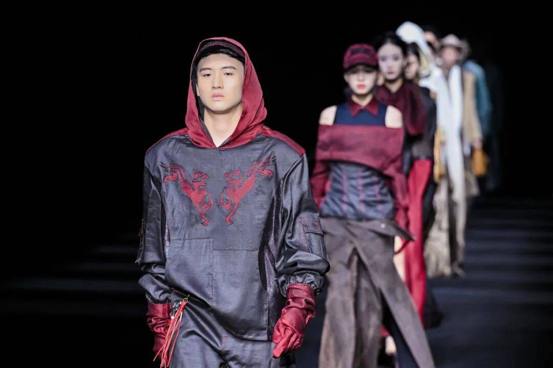 广州市纺织服装职业学校则以 “岭南文化” 为内核,推出 “醒狮元素” 与 “香云纱潮牌” 两大主题系列,让传统非遗焕发新生。醒狮系列以朱红、明黄为主色,通过符号提取与日常化设计,将民俗厚重感转化为年轻活力;香云纱潮牌系列则结合宽大版型外套、金属配饰等潮流元素,让“软黄金”走进年轻人的日常穿搭;为迎接第十五届全运会,展演中还特别呈现运动机能风服装,展现青年一代的朝气蓬勃与昂扬风貌。