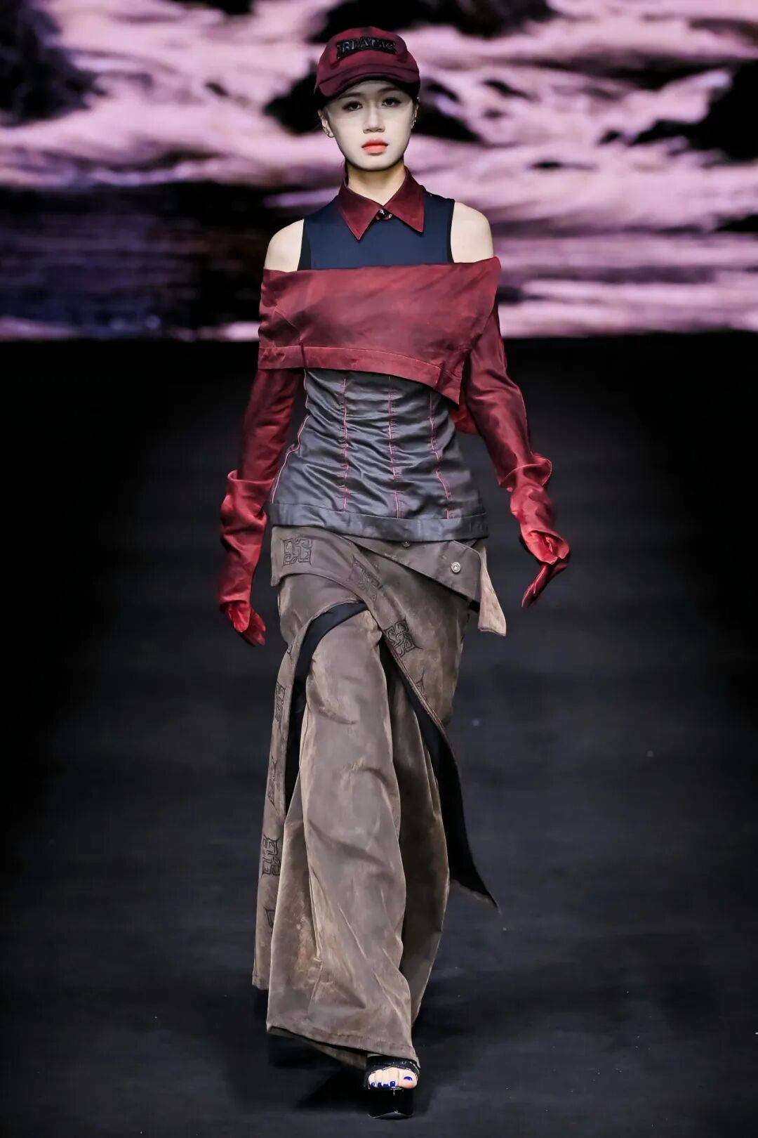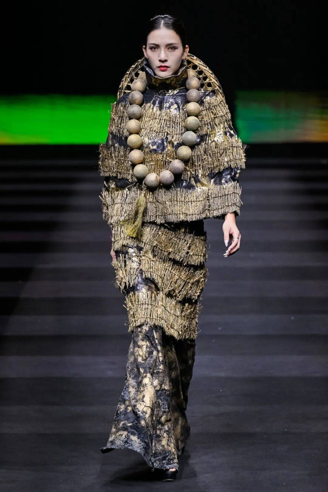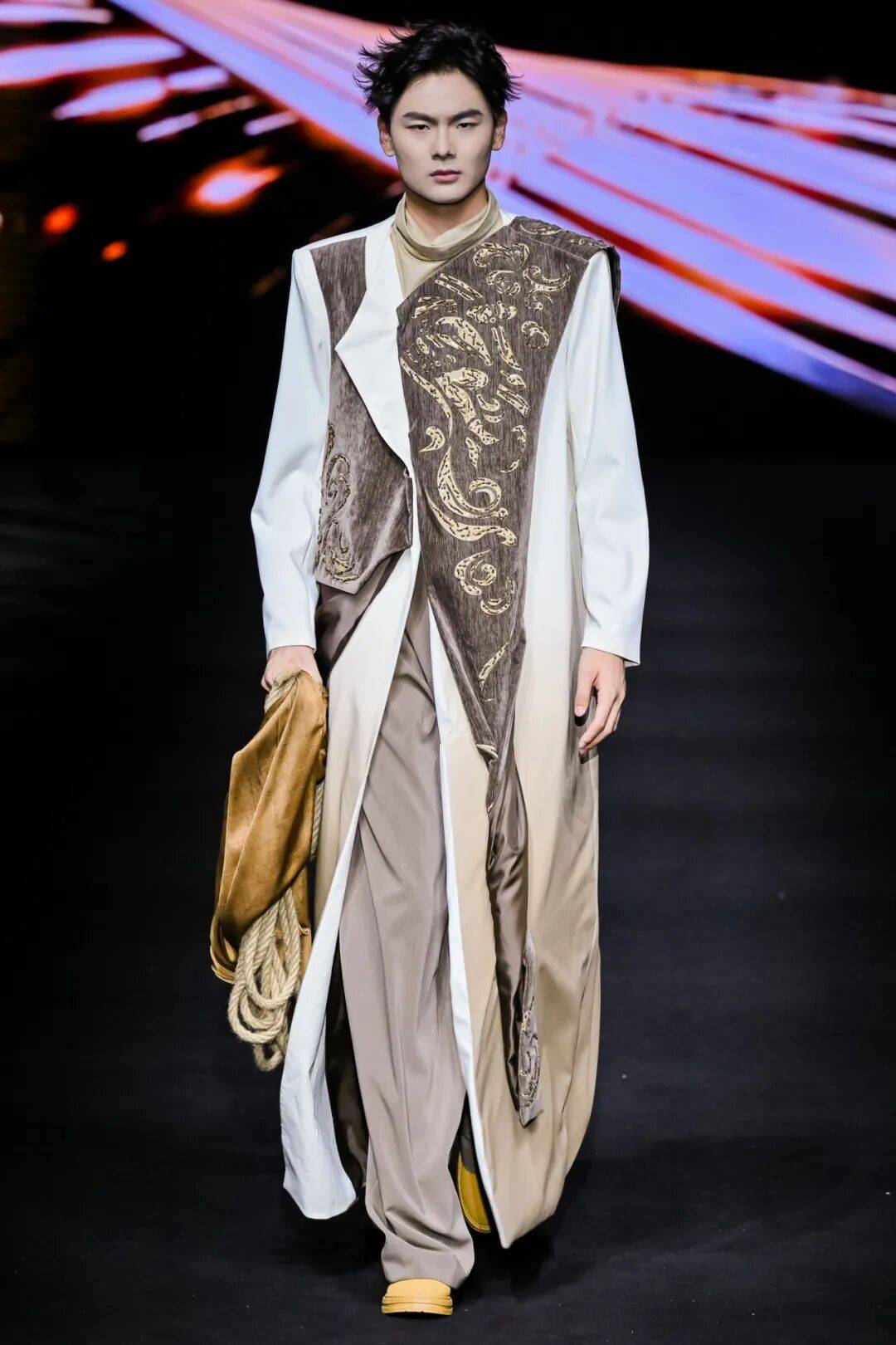 广州市纺织服装职业学校则以 “岭南文化” 为内核,推出 “醒狮元素” 与 “香云纱潮牌” 两大主题系列,让传统非遗焕发新生。醒狮系列以朱红、明黄为主色,通过符号提取与日常化设计,将民俗厚重感转化为年轻活力;香云纱潮牌系列则结合宽大版型外套、金属配饰等潮流元素,让“软黄金”走进年轻人的日常穿搭;为迎接第十五届全运会,展演中还特别呈现运动机能风服装,展现青年一代的朝气蓬勃与昂扬风貌。