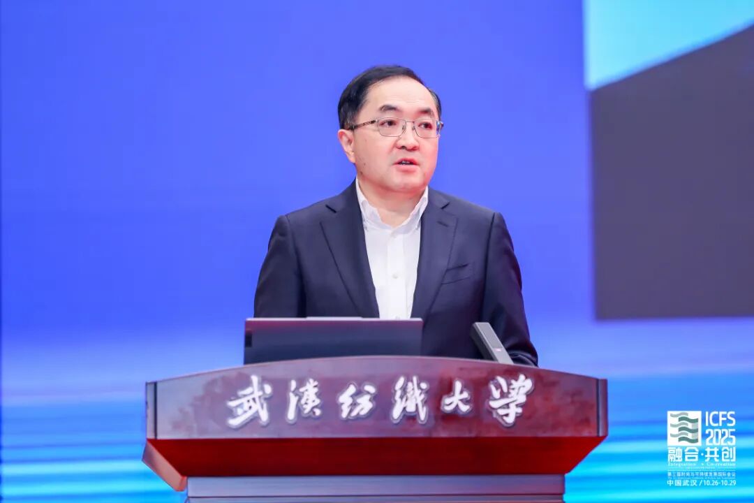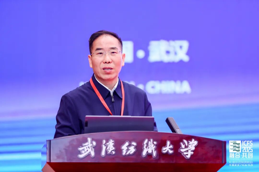 武汉纺织大学校长傅欣在致辞中表示,推动时尚产业绿色化、低碳化发展,是培育新质生产力、实现高质量发展的关键路径。他介绍了武汉纺织大学以“美好纺大”为引领取得的办学成就,包括纺织科学与工程学科稳居全球前列、徐卫林院士团队在航天纺织品领域的重大突破,以及“纺织新材料与先进加工技术全国重点实验室”的平台优势,并强调时尚可持续发展需依赖科技创新与文化传承双轮驱动。