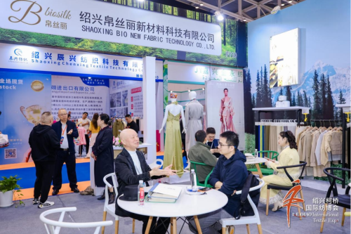 在2025第27届中国绍兴柯桥国际纺织品博览会(秋季)上,人流如织的展馆内,一个以“绿”为基调的展位——F110,吸引着众多专业买手与品牌设计师驻足流连。这里是浙江汇纤纺织科技有限公司与绍兴帛丝丽新材料科技有限公司的联合展台,双方共同呈现的核心环保产品——“帛桑”系列,正以其天然特质与科技内核,生动诠释“科技赋能帛桑,环保引领时尚”的参展主题。