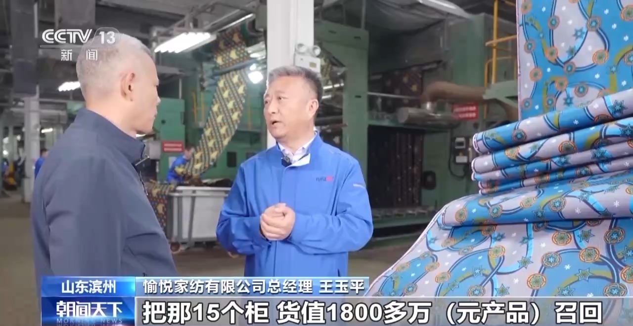 愉悦家纺有限公司总经理王玉平:“我们毫不犹豫地把15个柜、货值1800多万元的产品召回,并按废品处理。这个做法很值得,无论是最终的消费者还是经销商,看到我们有大的决心去抓质量。”