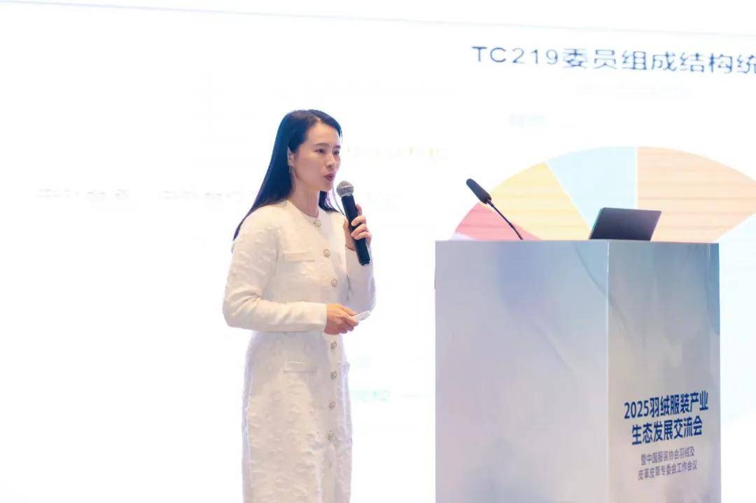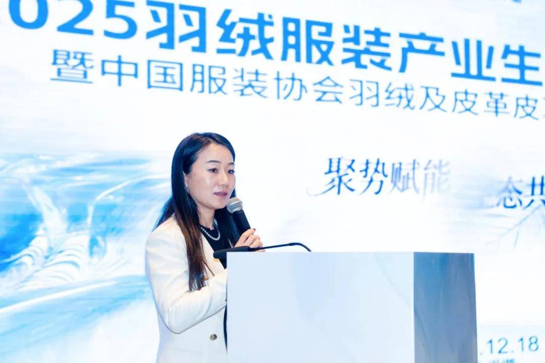 中国服装协会羽绒及皮革皮草专委会副秘书长黄珊分享了当前羽绒服装行业的发展概况,并发布了《羽绒服行业自律倡议》。