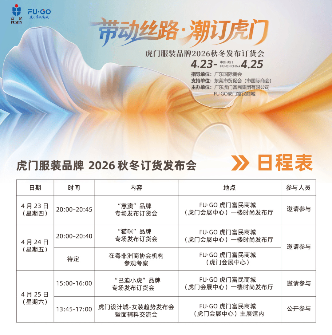重磅官宣!由广东国际商会作为指导单位,东莞市贸促会(市国际商会)作为支持单位,广东虎门富民集团有限公司、FU·GO虎门富民商城主办的带动丝路·潮订虎门——虎门服装品牌2026秋冬发布订货会,将于4月23日-25日,在FU·GO虎门富民商城(虎门会展中心)盛大启幕!