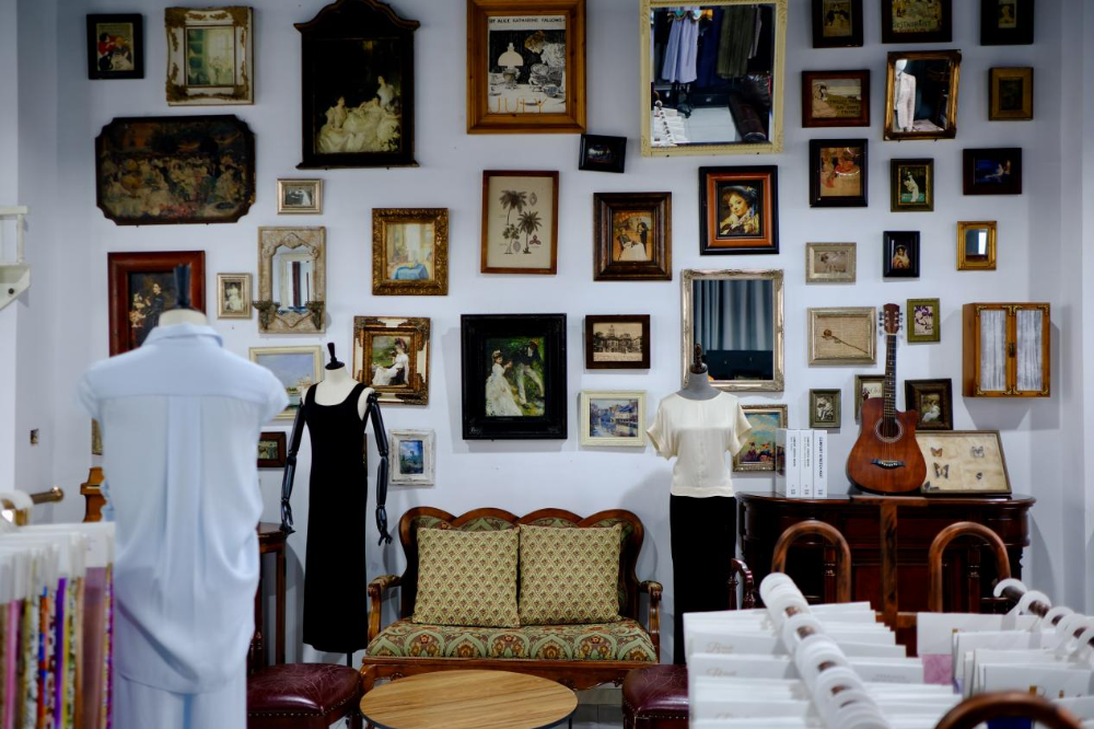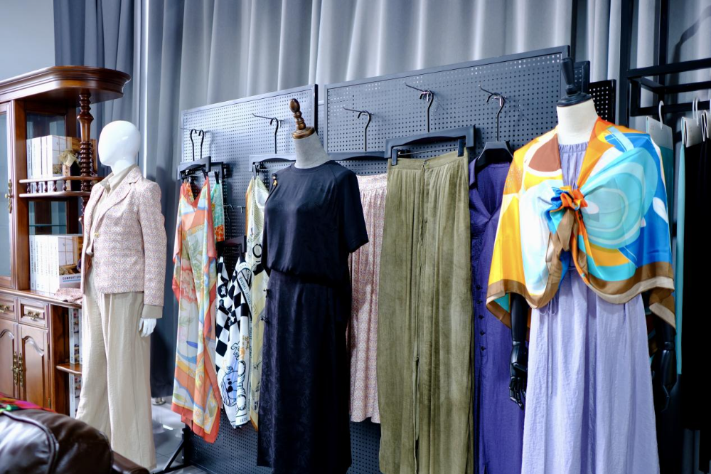 从纤维原料到面料织造,再到成品效果呈现,帛丝丽新材料致力于为客户提供一站式解决方案。这份服务不止于产品交付,还延伸到了客户的营销环节。帛丝丽新材料会为客户拍摄成衣效果视频,让终端消费者能够更直观地看到面料上身的表现力。针对直播电商客户,办公室内还特别设置了专属直播间,整面主背景墙以画廊式布局错落悬挂复古画框与造型镜,纯白墙面衬托出浓郁的文艺复古气息,客户到场即可开播,省去布景烦恼。