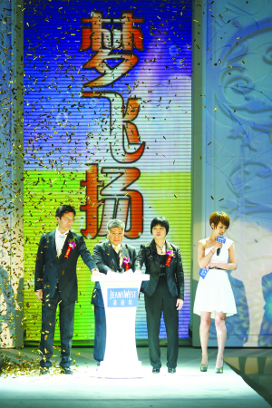真维斯国际(香港)有限公司董事长杨勋(中)、中国服装协会常务副会长陈大鹏(左)、中国服装设计师协会代主席苏葆燕(右)共同开启第20届“真维斯杯”大赛主题——梦飞扬。