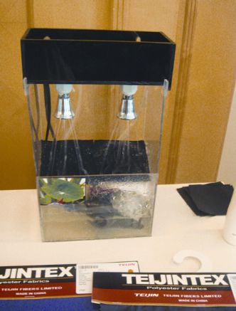 展馆的一个小装置吸引了记者的目光,这是“密可柔”仿荷叶面料的试水装置。长川研一向记者详细介绍了帝人集团开发的“密可柔”系列产品,这种新型面料是帝人公司率先推出的模仿荷叶结构的高防水、高透湿面料。荷叶表面的乳突保持了空气层的存在,利用空气的力量排出水滴。被客户誉为帝人特殊高密结构织物与独创防水加工技术完美结合的杰作。