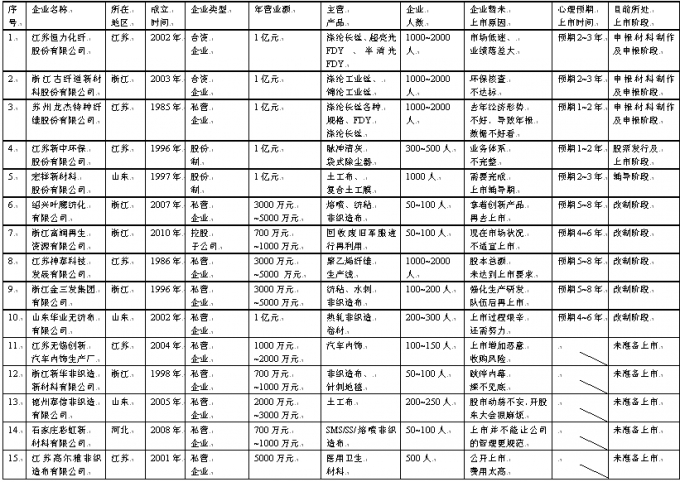 我国部分产业用纺织品企业上市进程反馈信息表