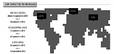 图片说明:美国的国内生产总值预计在2013年将增长约2.1%,其在2012年增长了2%;发展中的亚洲的国内生产总值预计在2013年将达到7.2%,其在2012年为6.7%;欧元区的国内生产总值预计在2013年将增长0.2%,其在2012年下降了0.4%。