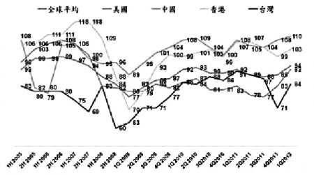 图片说明:2012年第一季度全球平均消费者信心指数为94。美国消费者信心指数为92。中国消费者信心指数为110。香港消费者信心指数为103。台湾消费者信心指数为84,反弹13点,恢复至正常状态。