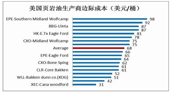 综合目前的情况考虑,我们认为2015年上半年原油价格将呈现继续走弱趋势,但原油价格的回落将导致美国页岩油开采利润萎缩,当原油价格触及页岩油的开采成本时,美国页岩油可能会出现减产,这个可能原油价格短期见底的信号。综合目前信息,受各个产区成本不同美国页岩油开采成本最低点在40~50美金/桶之间,而美国十八个页岩油产区成本中线在55美元/桶,所以我们分析后认为原油短期低点可能在40美金/桶附近。