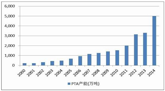2014年PTA价格走势基本雷同于PTA指数的走势,再次我们不再赘述。PTA价格下跌,且从近几年的走势来看,可以看到其价格总体呈现出逐步走低态势,这与PTA产能扩张的速度是相吻合的,我们从下面的图表中可以清晰的看到,近几年PTA的长能逐步扩张。2014年的新增产能约为1700万吨,较2013年的 3295万吨增幅达到52%,2013年相对于2012年增幅不明显,而在此之前的2012年,PTA产能由2011年的2000万吨增至3146万吨,相较于2011年增幅更是高达约 57%。也就是国内PTA总产能由2011年的2000万吨到目前的5000万吨仅仅用了三年时间,三年差能增幅高达150%。