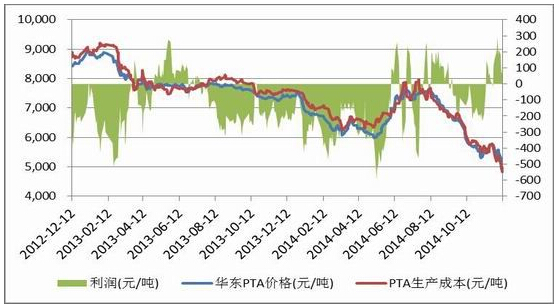 我们在前面看到PX与原油的相关性超过95%,我们前面预估的2015年度原油价格将再4070美元/桶之间波动,而对应的PX价格将会在685~1050美元/桶之间波动,根据简单成本测算,2015年PTA的低点可能出现在4000附近,而高点将会进一步下移,高点我们预计会在5700一线。