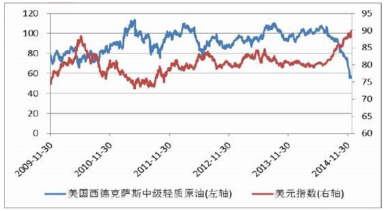 由于今年美国长债收益率回落、油价回落,居民的可选消费有望在2015年上半年提速,美国GDP估计在2015年1~2季度加速至3.5%左右,第三季度更是达到了5.5%。联储编制的美国劳动力市场指数在2013年年中已经超越长期平均水平,如果美国GDP2015年1~2季度加速,美国劳动工资很可能将开始出现上行。美联储在 2014年中加息的可能性较大。美国经济好于欧元区,对美元指数的主要货币所在国家或区域也明显有优势,因此美元强势是大概率事件。