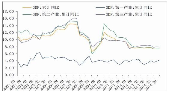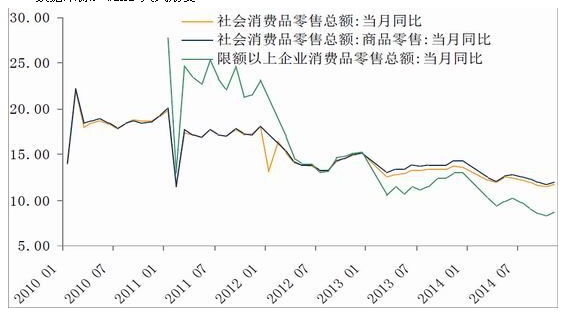 经济增长模式的改变,带来了改革的阵痛,数据方面看,2014年GDP增长预期为7.4%较2013年下滑,同时根据社科院的预测,2015年的GDP增长为7.1%,经济增速下滑的同时我们还看到一直寄希望的消费增速并未出现,2014年消费领域整体增长动力依然不足,社会消费品零售总额同比涨幅低位徘徊。