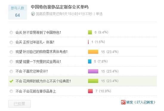 根据新浪时尚官方微博的调查结果来看,爆出了打脸消息,有网友表示:像是二舅奶奶同款。话虽然有点过激,不过根据投票显示,超过一半的人直接表示不会考虑,而还有30%的人持观望态度,最后的11%的网友表示会购买。本来是一番好意,却因为没能仔细考究而酿成了“地摊货”的尴尬,真是枉费了一番苦心。
