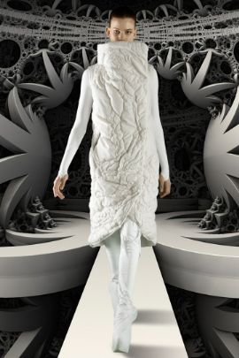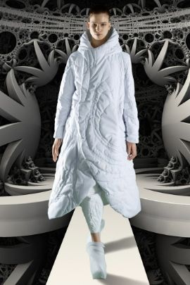 ThreeAsFour (不三不四) 2014秋冬女装,将形态作为这一季的主题,从人类的形态的韧带、指纹再到地理形态的石头、木材、冰川、云层在一片白色下展现。但多重扭曲的绗缝、刺绣,所表现出来的肌理效果,以及没有密集恐惧症的人看到,也会心声不悦。