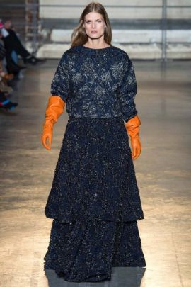 Rochas过于强硬的漆皮面料成为2014秋冬女装的最大败笔,同时,满满的水晶布满整件衣服,也更显厚重。古怪的提花+及地长裙+高领+漆皮长手套,多套这样的搭配造型,让人喘不过气来,所以肌肤都被厚重的面料以及图案、水晶覆盖,或许设计师应该多体会下“less is more”的真理。