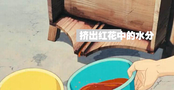 古人采用红花泡制红色染料的过程如下:将带露水的红花摘回后,经“碓捣”成浆后,加清水浸渍。在中性条件下,黄色素溶解,用布袋绞去黄色素(即黄汁),这样一来,残花中剩下的大部分已为红色素了。之后,再用已发酸的酸粟或淘米水等酸汁冲洗,进一步除去残留的黄色素,即可得到含有红色素的残花饼。这种提取红花色素的方法,古人称之为“杀花法”,此方法在隋唐时期就已传到日本等国。如要长期使用红花,只须用青蒿(有抑菌作用)盖上一夜,捏成薄饼状,再阴干处理,制成“红花饼”存放即可。待使用时,只须用碱水或稻草灰澄清几次,红色素溶解出来,便可进行染色了。最后用乌梅酸性水处理一道,相当于固色,红色淀生成,染色过程结束。“红花饼”在宋元时期之后得到了普及推广。另外古代把红花素浸入淀粉中,也可以做胭脂。