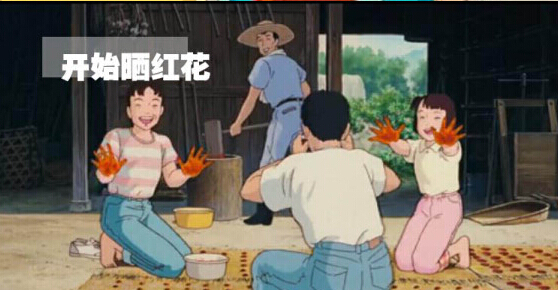里面的一位女主人公从繁华的东京去她阿妈家体验乡村生活。她去体验什么呢?就是去采红花,还用红花染色。