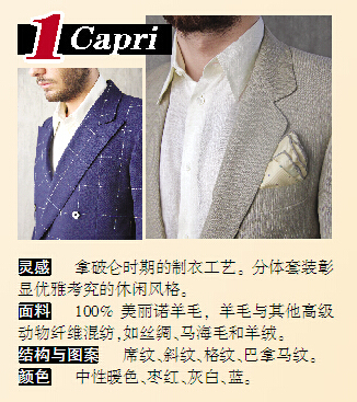 今年的“The Wool Lab 2016春夏流行趋势”分为两大主题:男装的卡普里(Capri)主题和女装的蒙特卡罗(Montecarlo)主题,两个主题贯穿着经典优雅的格调。