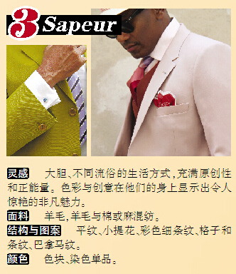 Sapeur这一主题源自格调制造者与优雅人士协会所掀起的“考究衣着”运动,最早发源于刚果。Sapeur风潮盛行于上世纪70年代,是对当时独裁者强制刚果民众穿着传统沉闷的束腰外衣的反抗。Sapeur运动是对欧美时尚风格的颠覆,从而形成一种新兴的优雅男装风格。浓烈的色彩,精心搭配的衣着,与人们日常思维概念中的男装风格形成鲜明对比。