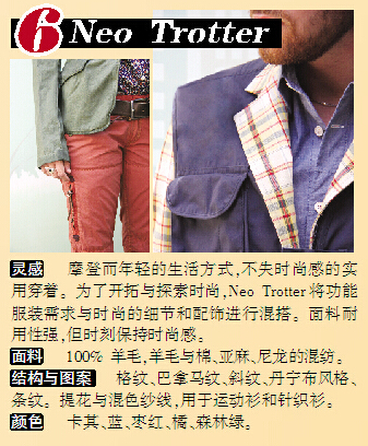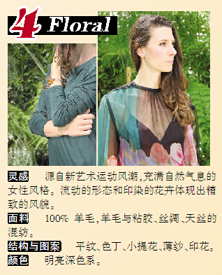 “The Wool Lab 2016春夏羊毛流行趋势”一共推出6大灵感主题,即诠释了6种潮流趋势。Floral主题彰显女性气质,灵感源于大自然的花卉,最初发轫于新艺术运动。NeoTrotter则突出表现了摩登而年轻的生活方式,于实用穿着中融入时尚之感。