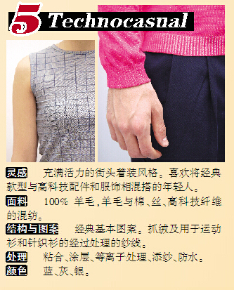 Technocasual主题呈现出强烈对比的时尚风格,羊毛面料与最前沿的技术创新相结合,令经典成衣展现出焕然一新的面貌。