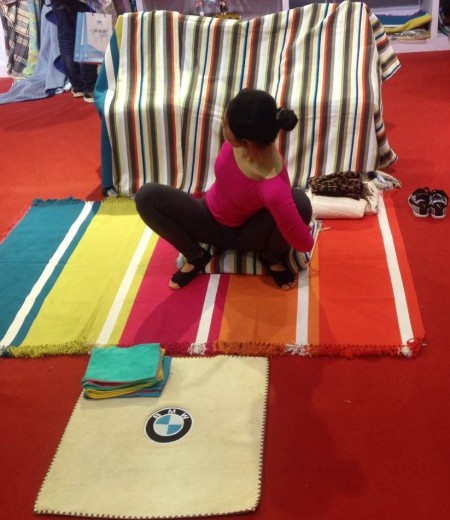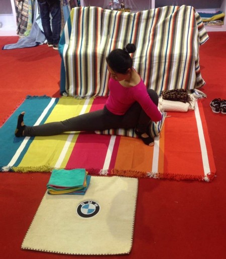 上海踏绮纺织在展位上特别瑜伽师来展示自己的瑜伽垫系列产品。据悉,踏绮生产的瑜伽垫系列产品具有可机洗的特点,比传统的塑料瑜伽垫更具使用价值。