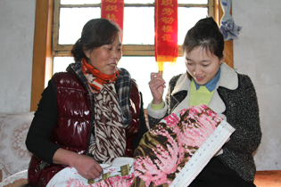 鞠珊和婆婆一起绣十字绣。