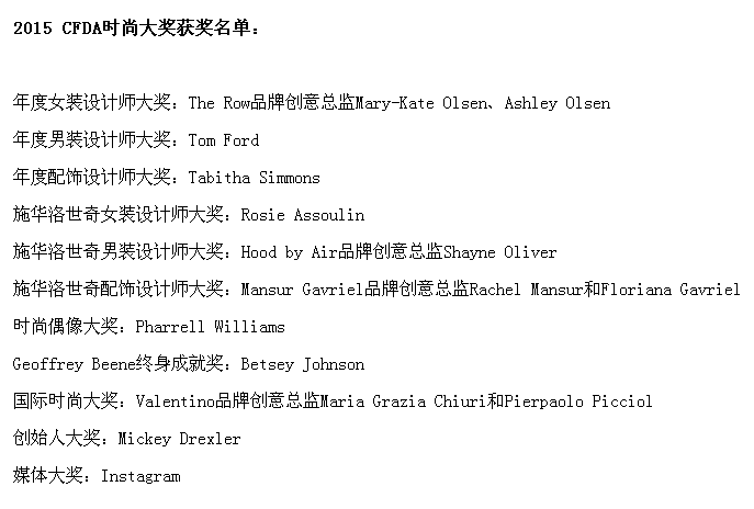2015年CFDA时尚大奖颁奖礼获奖名单出炉