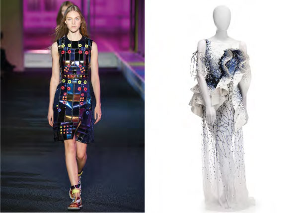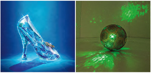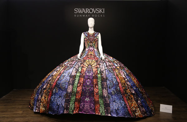展品包括:Pierre Balmain 1961 年设计的一件复古风高级定制礼服、由设计师及施华洛世奇集体创作项目成员马玛莎和Peter Pilotto 操刀设计的现代成衣,以及Atelier Swarovski 与Maison Martin Margiela 合作打造的首饰。其他引人注目的设计作品包括:惊艳非凡的秀台首饰,如王培沂设计的光束(Beam);金翀宇为施华洛世奇Runway Rocks 时尚秀设计的礼服;来自北京的设计师李鼐含打造的互动性艺术作品水晶拼图(Crystal Puzzle)。施华洛世奇与电影行业创意人才之间的合作则体现在互动性的数码水晶鞋体验中,旨在向为今年迪斯尼出品的真人版《灰姑娘》专门打造的著名鞋履致敬。