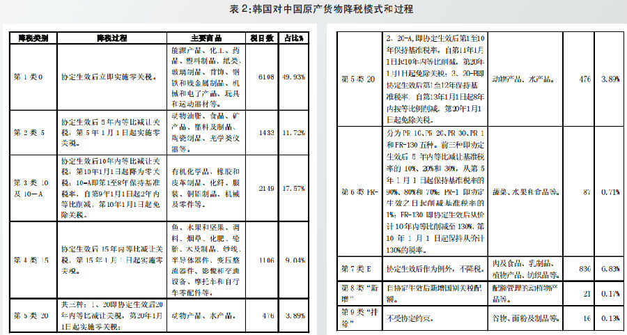 由于中韩互为重要贸易伙伴,双方产业结构近似,所以,自贸区对原产货物的关税减让较为复杂、用时长,最长需20年才能完成降税过程。