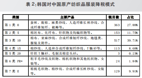 在韩方降税承诺表中共有1302个10位税目的纺织品服装,协定生效10年后将有79.34%的产品降为零关税。20年降税过渡期结束后,将有88.25%的产品降为零关税,不降税产品占纺织品服装税目总数的9.91%,占韩方对中方全部不降税产品税目总数的15.4%(详见表2)。
