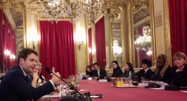 马蒂亚斯·费科尔(Matthias Fekl)(左1)在法国外交部与来自中、美、日、韩四国的时尚媒体代表团见面交流。