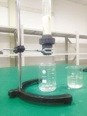 实验人员拿来一桶从周边河道打来的水,明显有些浑浊。将水倒入试管,再通过这些“面条”过滤,就变成了清洁无味道的水,透过过滤装置滴出。