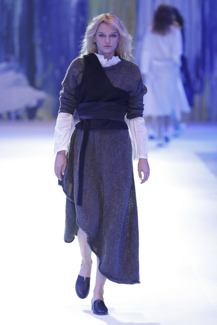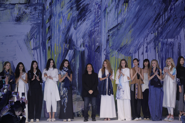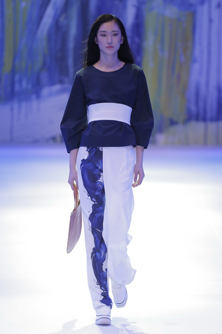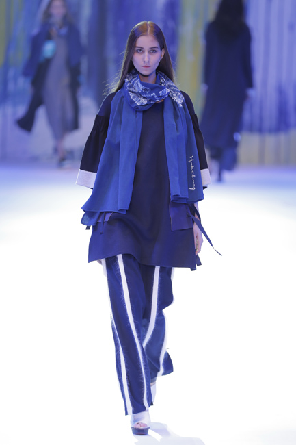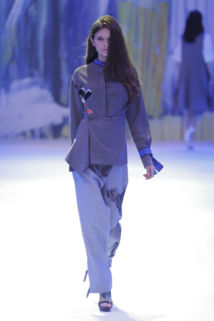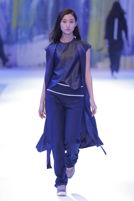 发布会以个性、简洁的中式休闲风格作为开篇。在宽松立体的茧型轮廓上,将中式连肩袖中,肩头自然垂坠下去如行如流水般层层的皱褶加以解构与抽象,除彰显个性外,暗喻其中式内涵。搭配上,腰间与口袋上随性、轻松的系带设计,在摒弃浓郁的中式面貌后,仍保有传统的气节与美韵。第二系列以灰和蓝为主调,在腰部设计上,利用系带和打褶的方式进行了多种处理,具有飘逸、空灵的禅味。选用与上衣整体感觉形成反差的面料设计仿中式立领和袖口翻边,在中式韵致中体现个性时尚。第三系列以宽松的大衣与轻薄的针织衫进行多层次的搭配,将对襟、开衩、布扣(盘扣?)的感觉用时尚风格呈现。丝质面料与柔软的针织衫巧妙结合,展现慵懒、随性的状态。第四系列运用宝蓝色主调,以温润的粉色为点缀,营造细腻清雅的层次感,呈现雅致、含蓄、柔和的风格。