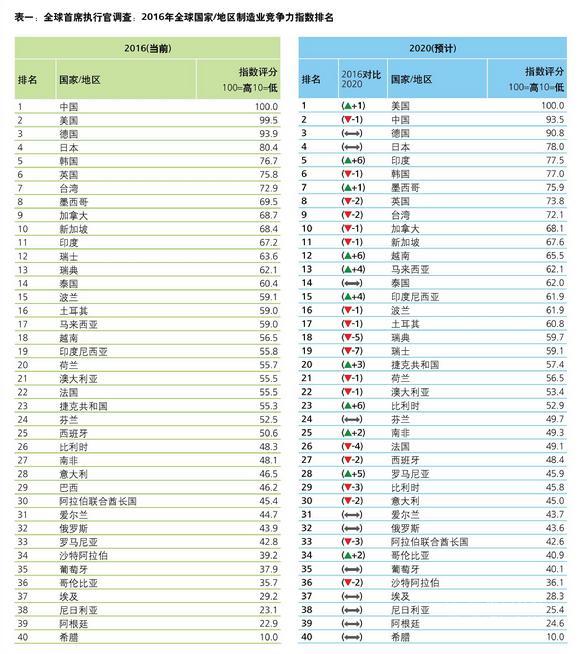 《全球制造业竞争力指数》每三年发布一次,其研究是在对全球超过500名制造业CEO和高管进行调研访问的基础上深入分析得出。根据全球企业高管对未来五年发展情况的预期来看,在2020年之前,美国的制造业竞争力将超过中国,位居全球第一。