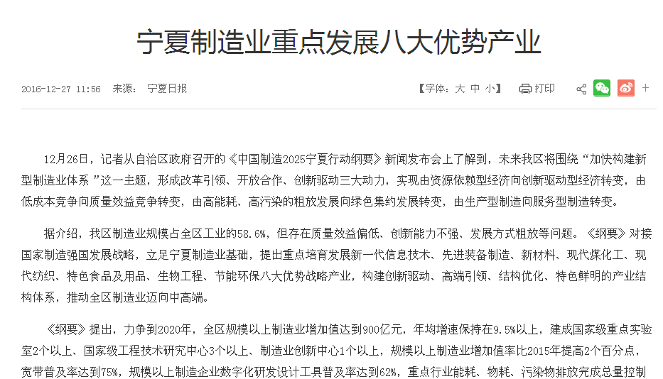 就在会议召开前一天,12月26日,宁夏自治区政府召开《中国制造2025宁夏行动纲要》新闻发布会。未来宁夏自治区将围绕“加快构建新型制造业体系”这一主题,形成改革引领、开放合作、创新驱动三大动力,实现由资源依赖型经济向创新驱动型经济转变,由低成本竞争向质量效益竞争转变,由高能耗、高污染的粗放发展向绿色集约发展转变,由生产型制造向服务型制造转变。这份《纲要》提出:重点培育发展新一代信息技术、先进装备制造、新材料、现代煤化工、现代纺织等优势战略产业。