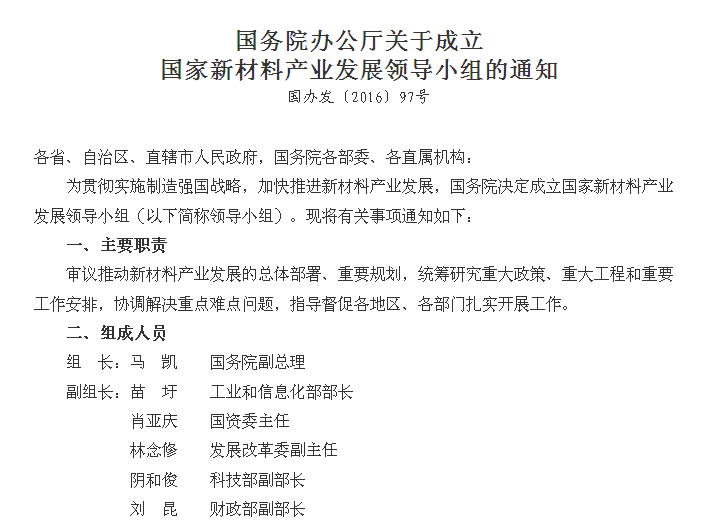 为贯彻实施制造强国战略,加快推进新材料产业发展,国务院决定成立国家新材料产业发展领导小组。国务院副总理马凯任组长,工业和信息化部部长苗圩、国资委主任肖亚庆、发展改革委副主任林念修、科技部副部长阴和俊、财政部副部长刘昆任副组长。该小组主要职责为审议推动新材料产业发展的总体部署、重要规划,统筹研究重大政策、重大工程和重要工作安排,协调解决重点难点问题,指导督促各地区、各部门扎实开展工作。